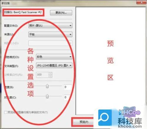 3. 在“新扫描”窗口左上角确认扫描仪是否正确,左侧各种设置选项是否符合你的需求,如果需要可以先点击右侧下方的“预览”键,扫描仪会进行粗略扫描,并将图片显示在右侧“预览区”,如果无误,可以点击右侧下方的“扫描”键开始扫描;