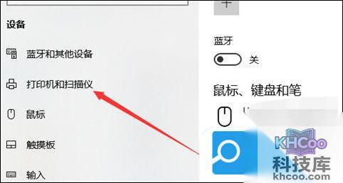 3、默认打开蓝牙设置页面,点击左侧的打印机和扫描仪选项。