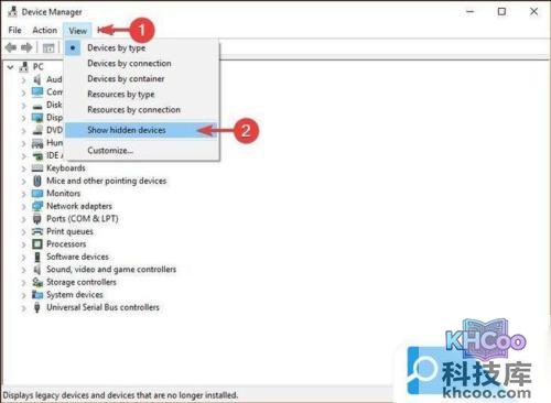 --单击顶部菜单上的查看>选择显示隐藏的设备。