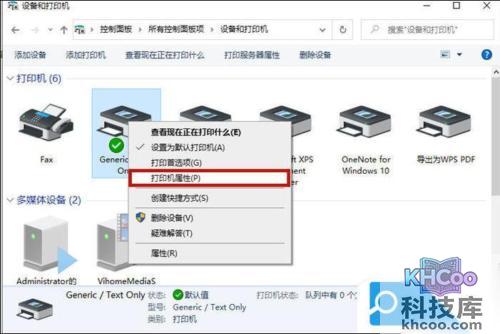 3. 之后选择当前已经连接的打印机,右键该打印机,选择“打印机属性”;