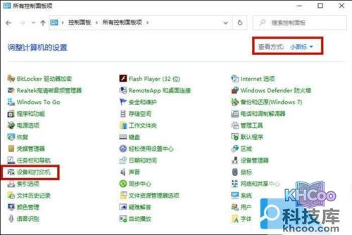 2. 在控制面板中将“查看方式”改为“小图标”,然后选择“设备和打印机”;