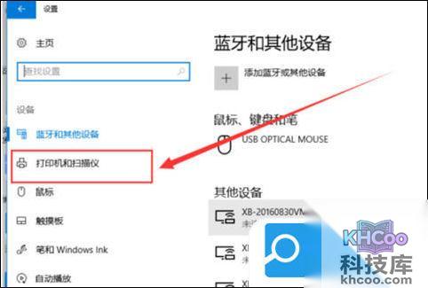 3. 进入“设备”页面,在左侧栏中选择“ 打印机和扫描仪 ”;