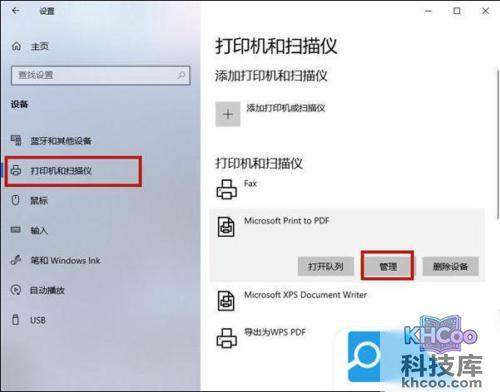 3. 选择左侧的“打印机和扫描仪”窗口,在此窗口下找到脱机的打印机,单击后选择“管理”功能;