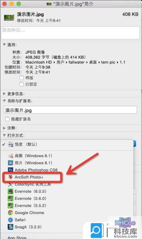 3.单击“打开方式”下面的下拉框,找到你自己想要的程序,我苹果电脑里装的是Arcsoft photo+.app 所以我这里选择这个,如下图: