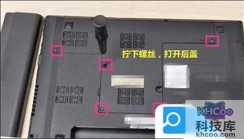 2. 电池拆卸下来后,使用螺丝刀,拧下笔记本背后T型区域的螺丝,然后打开后盖;