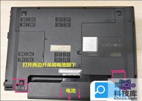 1. 给笔记本安装内存条之前,翻转笔记本将电池卸下,拆卸方法:在背面将右边电池锁开关打开,左边的电池锁往左推(保持不动),然后将电池卸下;