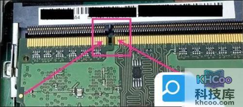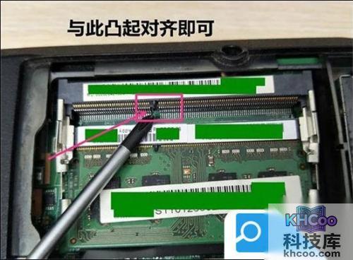 4. 插入内存条的时候需要注意:首先要确定内存条的正反面,在内存条上有一个小口(缺口),只需将此小口与内存条插座上凸起来的地方对齐即可;