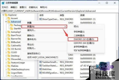 5. 【 右键】点击【 Advanced】,在打开的菜单项中,选择【 新建 - DWORD (32 位)值(D)】。