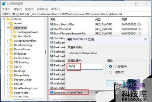 6. 新建的DWORD (32 位)值(D)命名为【 ExtendedUIHoverTime】并【 双击】打开,将数值数据修改为【 9000】。