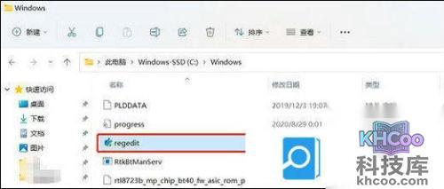 3、或者通过【win+E】打开文件资源管理器,进入【C盘】-【Windows】文件夹下,找到【regedit】文件,双击打开;