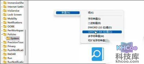 4、接着在system文件的右侧栏目空白处进行点击,在出现的选项中选择“新建一个【QWORD(64)值】”。
