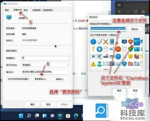 第三步 在快捷方式中找到更改图标选择与此电脑一致的图标,并在图标上方点击浏览 找到C:\WINDOWS\SYSTEM32里面找到imageres.dll文件点击确定。