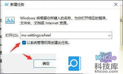 2.接着我们在该界面之中勾选“以系统管理权限创建此任务”,输入指令“ms-settings:wheel”,按下回车确认;
