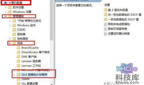 3、在本地组策略编辑器窗口的左栏,依次寻找并点击“计算机配置——管理模版——网络——QoS数据包计划程序 ”。