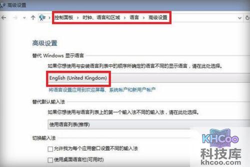 6、点击“ 控制面板 ”-“ 时钟、语言和地域 ”—“ 语言 ”—“ 高级设置 ”,最后将语言调整“ English ”即可。