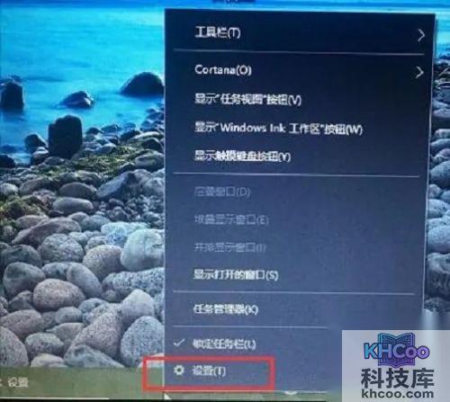 1、请将鼠标的光标定位在桌面下方任务栏的空白部分,然后轻轻单击鼠标右键,将会出现一个弹出窗口,在此窗口中,找到并按下最后一个“ 设置 ”选项。