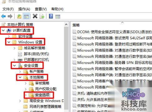 2、展开“计算机配置-windows设置-安全设置-本地策略”,点击安全选项