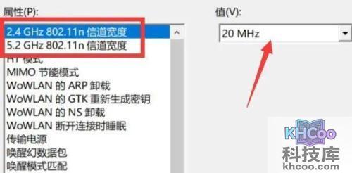 4、随后我们在打开的界面中,将2.4GHz和5.2GHz属性直接改成20mHz且保存下来。