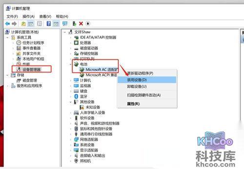 2、进入管理的界面以后,我们找到设备管理器,在这里选择电池,右键以后在弹窗中选择禁用该设备。
