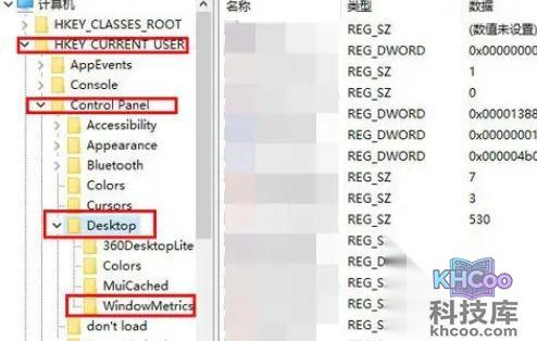 2. 启动注册表编辑器后,逐项点击左栏,直至定位至:HKEY_CURRENT_USER\Control Panel\Desktop\WindowMetrics子项。