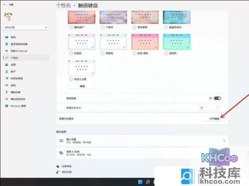 设置窗口,左侧点击个性化,右侧点击触摸键盘(主题、大小)