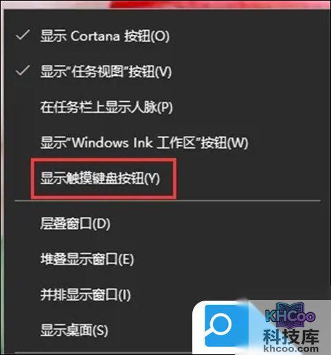 1、右键点击任务栏空白处,点击“显示触摸键盘按钮”。