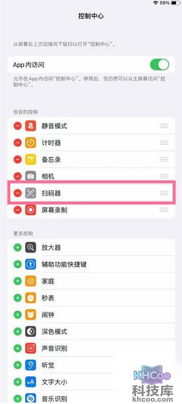 第一步:从设置菜单中点击控制中心,把扫码器添加到控制中心就可以了。