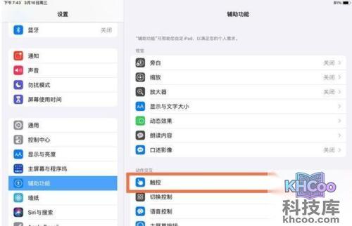 1、在设置中点击【 辅助 功能】,选择【触控】。