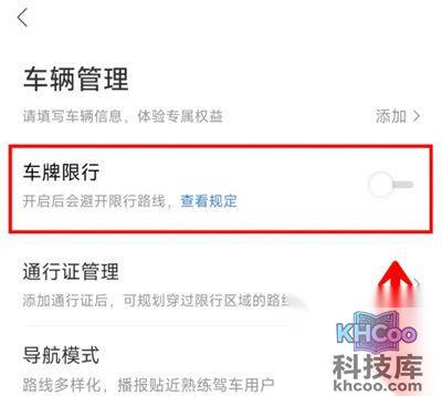 4.最后在车辆管理页面里就能看到“车牌限行”了,在它的后面点击开关按钮去设置,当按钮显示为彩色时代表开启该功能。