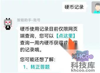 4、在与客服智能助手的对话栏中输出【硬币记录】查询,然后点击客服给出来的链接 【点这里】 。