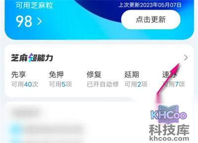 2. 来到芝麻信用页面后,在中间部分“芝麻超能力”的后面有一个箭头,在上面点击。