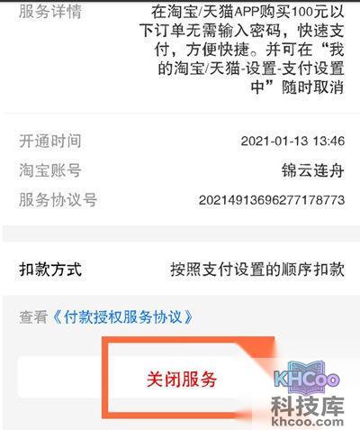 在小额免密支付功能的页面中,用户可以通过关闭 服务 选项,即可关闭小额免密支付功能。