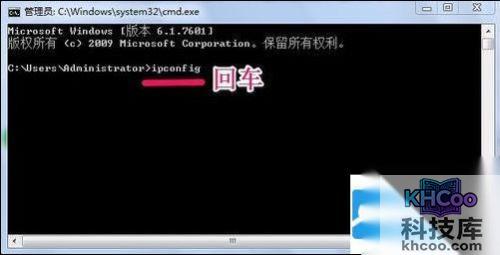 在命令提示符窗口中输入命令ipconfig,然后回车!