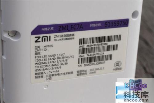 默认的网络名称:ZMI_FC7A(后面4位为MAC地址末尾4位),SSID密码为:51359750;网络名称和密码都可以登录ZMI MF855后台地址192.168.21.1修改,后台管理密码zimifi。很多小伙伴们关注的频段,全部印刷在了铭牌上,出国漫游前则可以找到对应国家的频段,看是否兼容。这里拿到的是工程样机,因此没有粘贴入网许可证。