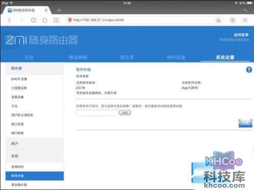 系统设置里选项丰富,其中软件升级菜单里面可以对随身路由固件进行升级,目前固件最新版为2.0.74。已连接设备里能看到设备名称、IP地址等信息,但是无法让设备强制下线和设置上下行网速。