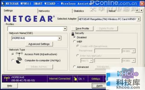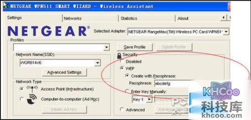 如果使用NETGEAR的无线管理工具,则需要记得abcdefg就可以了,如果使用XP自带无线管理工具,则需要将Key1记录下来(通常使用Key1,当然Key2/3/4也可以使用)。