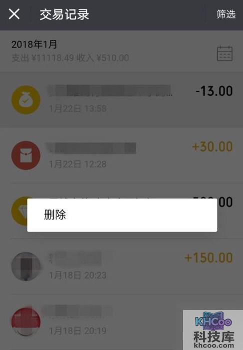 3、想删除微信支付账单的用户,那就找到想删除的支付账单信息,长按选择其中的“删除”功能就行了!