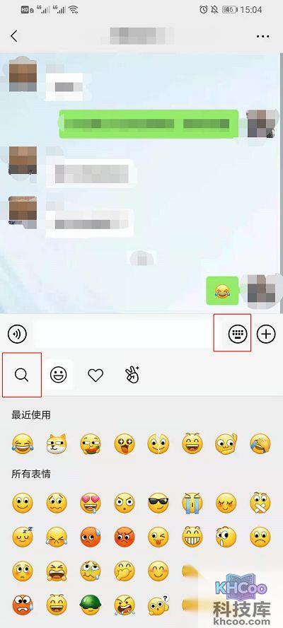2、在和好友的聊天界面中点击下方的【表情】进入到 表情包 界面,再点击左边的【放大镜标志】进入到表情搜索界面;