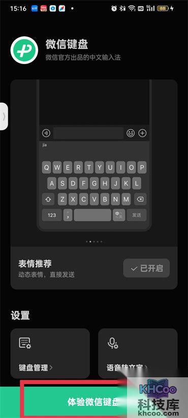 1.首先打开微信键盘软件,进入到此页面之后点击页面最下方的【体验微信键盘】;