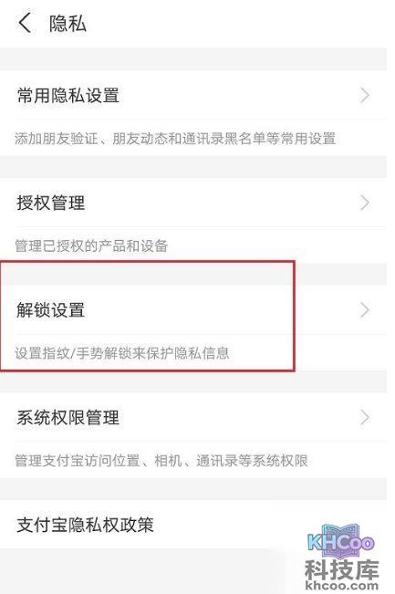 第三步:进去支付宝隐私界面之后,然后点击解锁设置