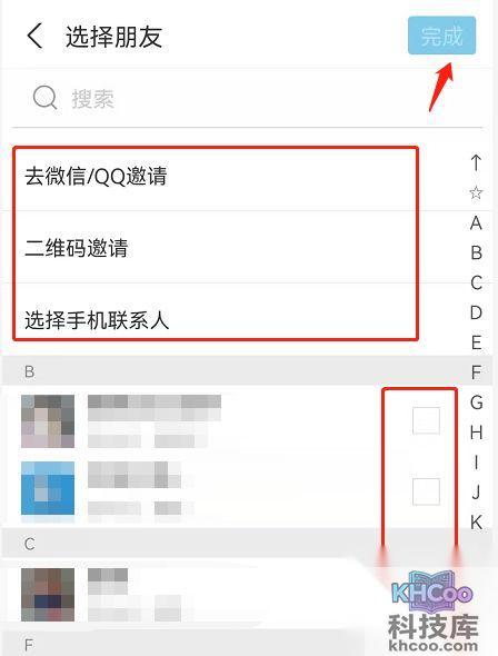 2、选择支付宝好友,或者通过上方分享给微信或者手机联系人,点击完成即可发送邀请,待好友同意后即可添加成功。