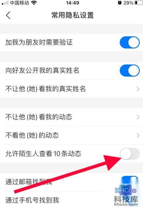 4、跳转到“常用隐私设置”界面之后,将“允许陌生人查看10条动态”右侧的滑块滑到最左侧