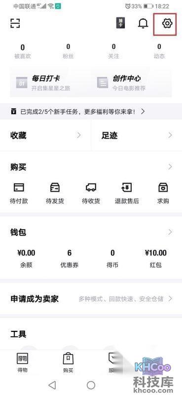 2、进去得物我的界面,点击设置图标,如下图所示: