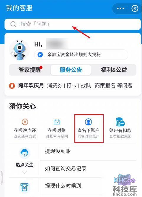 3、在我的客服页面里,打开查名下账户选项,如果没有的我们可以在 搜索 框进行搜索,也可以找到这个功能。