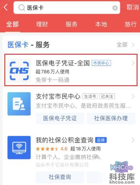 2、在 搜索 框中输入 医保卡 ,点击进入 医保电子凭证