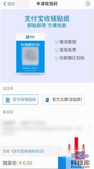 4.然后在申请收钱码页面中点击【同意并申请】,然后购买一个收钱贴纸,收到支付宝寄给你的收钱码后,就可以使用收钱码进行收款了。
