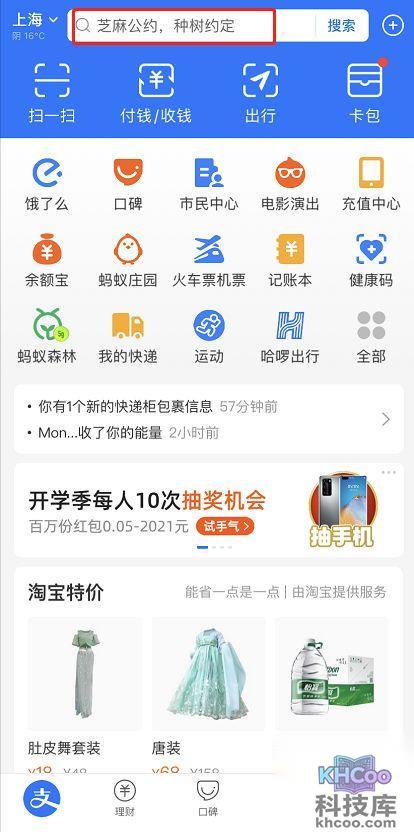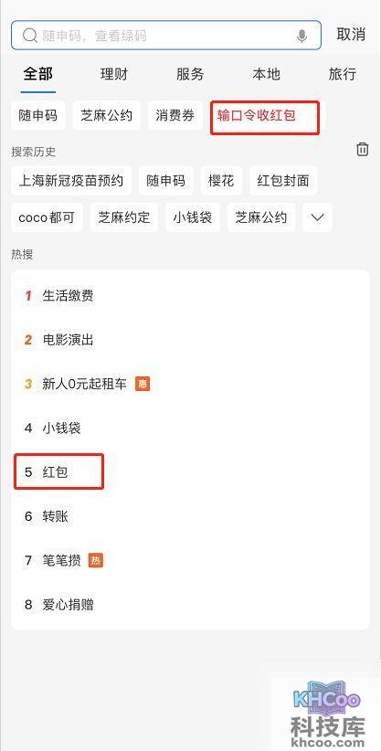 1.进入支付宝首页,在上方 搜索 框内输入“口令红包”