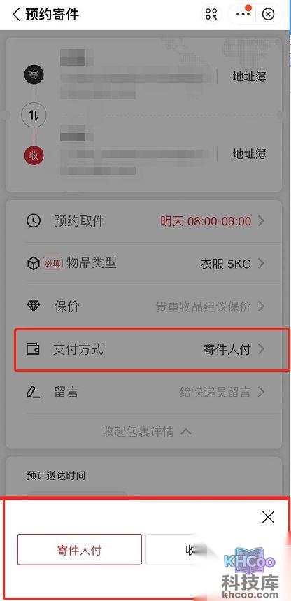 4、找到【支付方式】,选择【收件人付】就可以啦!