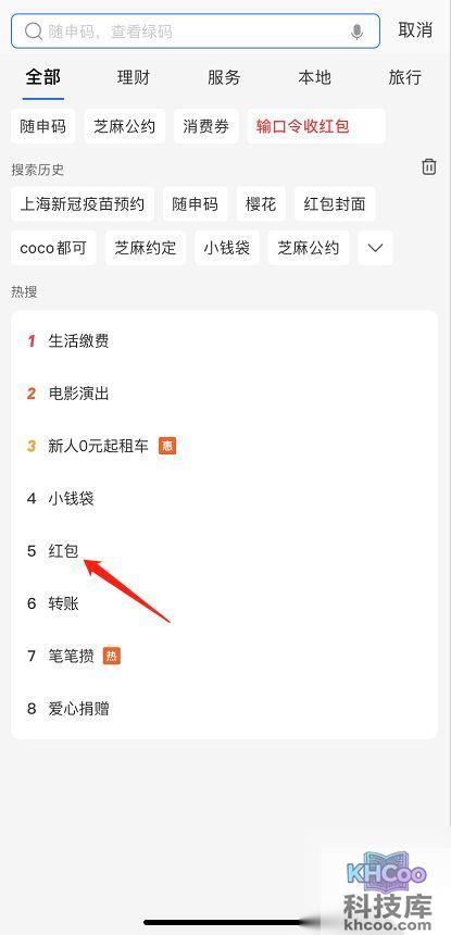 1.进入支付宝首页, 搜索 “红包”进入界面