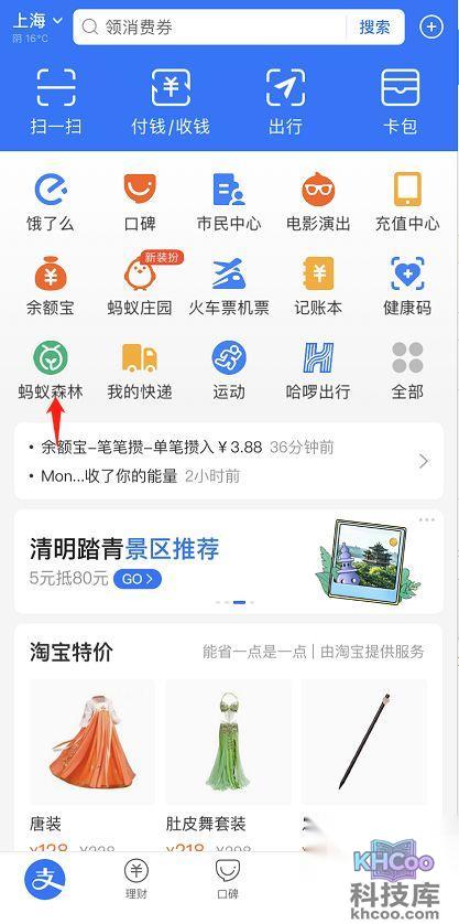 1.在支付宝首页,点击进入蚂蚁森林界面